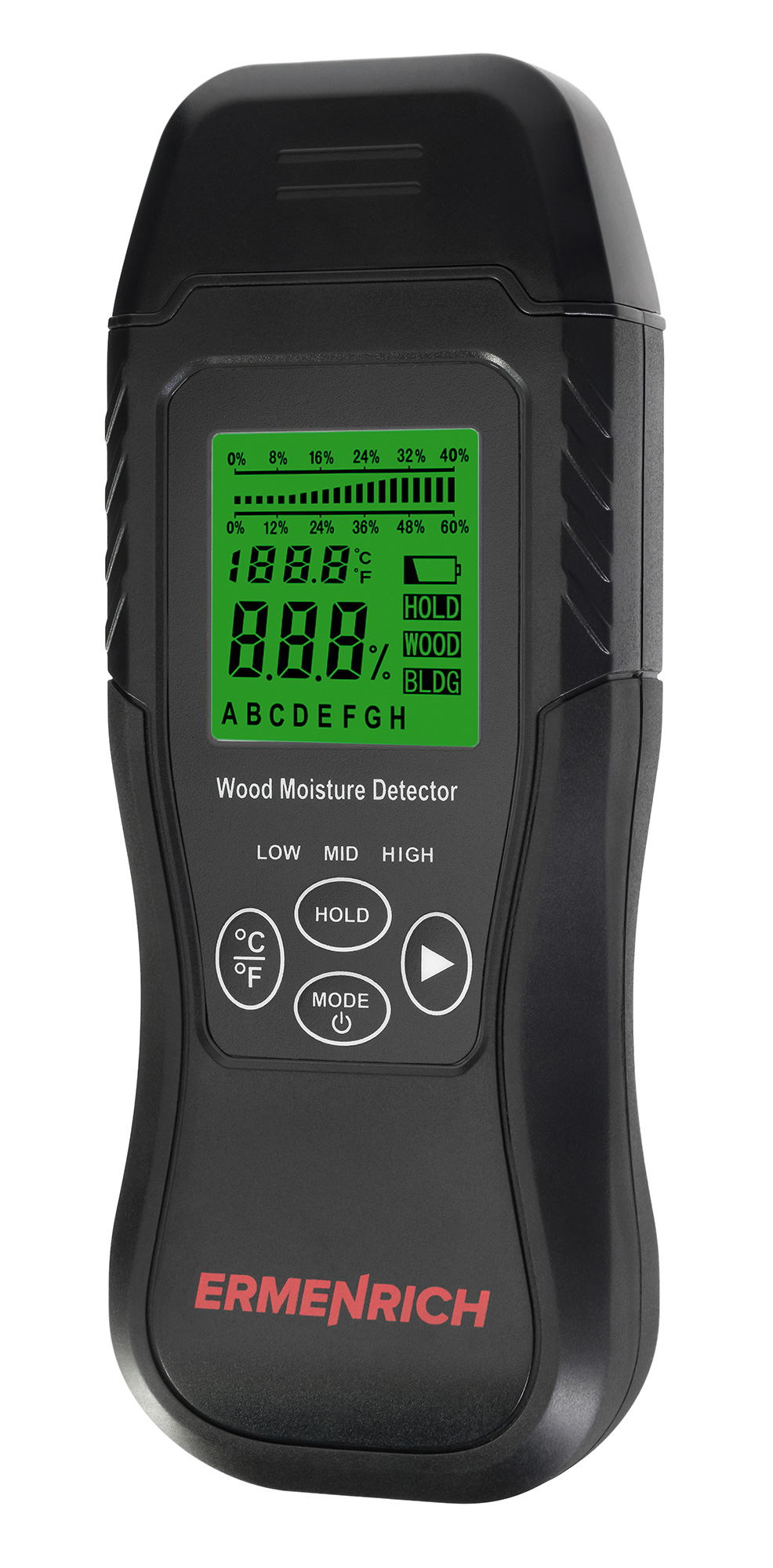 | Световая индикация | дерево: зеленый (<12%), желтый (12–15,9%), красный ( 16–60%), строительные материалы: зеленый (<17%), желтый (17–19,9%), красный (20–33%) |